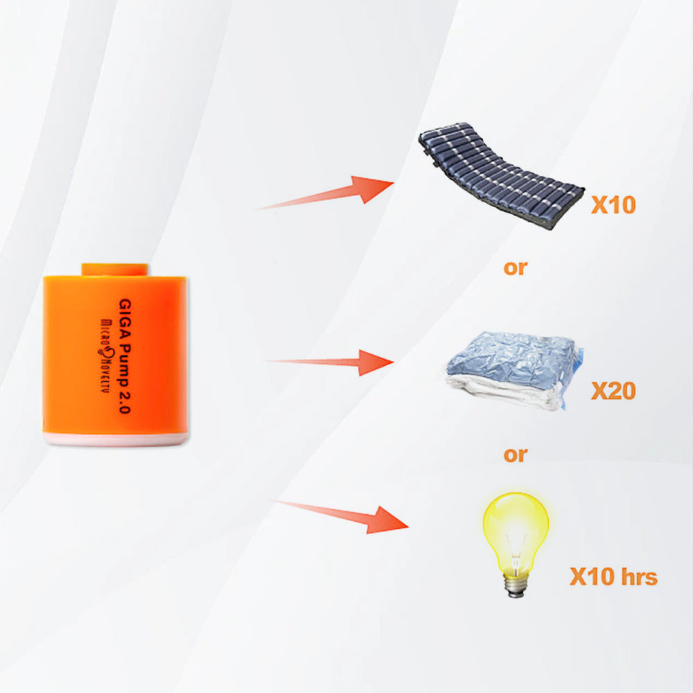 Angetrieben von einem wiederaufladbaren Lithium-Ionen-Akku reicht eine einzige Ladung aus, um mehr als 10 Ein-Personen-Luftmatratzen aufzublasen, mehr als 20 große Staubsaugerbeutel abzusaugen oder 10 Stunden lang Licht zu liefern.